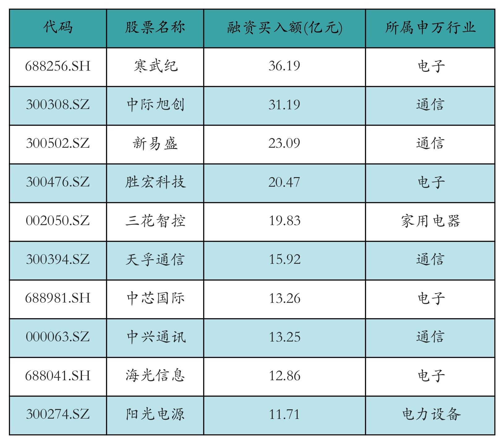 两市共有3455只个股有融资资金买入,其中寒武纪、中际旭创、新易盛排名前三,买入金额分别36.19亿元、31.19亿元、23.09亿元。融资买入额前10个股详情见下表:
